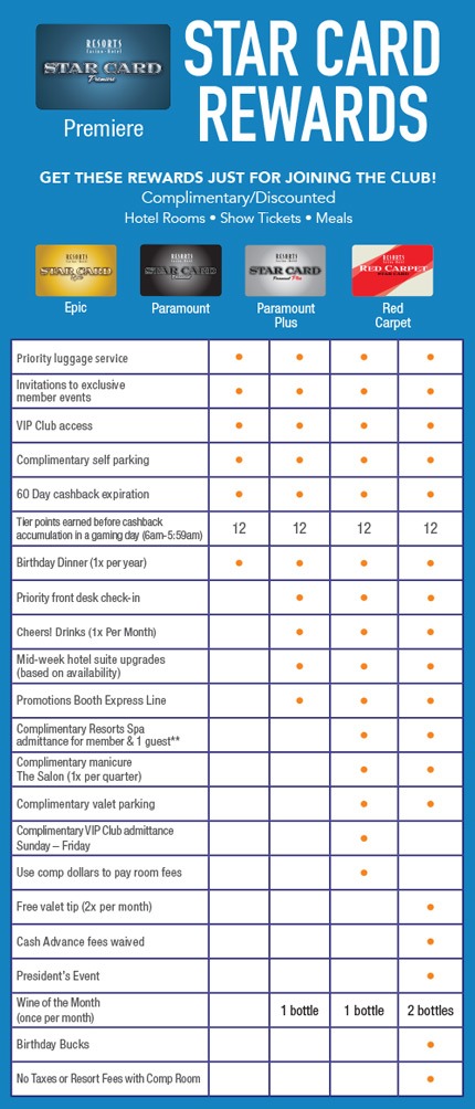 Five levels of the Star Card allow you to experience everything Resorts Casino Hotel has to offer. Use your Premiere, Epic, Paramount, Paramount Plus or Red Carpet card every time you play slots or tables to earn Atlantic City complimentary rooms, meals, entertainment & so much more! The Star Card Club calendar period is October 1 to September 30.